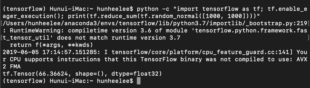 $ python -c "import tensorflow as tf; tf.enable_eager_execution(); print(tf.reduce_sum(tf.random_normal([1000, 1000])))"