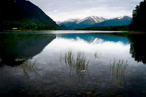 멀리에 있는 물의 표면에는 주변 환경이